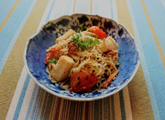 2022-01-15 イタリアン切り干し大根 料理(おかず) 先日作った韓国風切り干し大根がおいしかったので、今日はイタリア風(^_^)🎵にんにくを炒め、切り干しと高野豆腐、ミニトマトを入れます。トマトが少し煮くずれたら塩こしょうとドライバジルを振りかけて出来上がり(^_^)。バジルはあればフレッシュでも✨ 日本のおふくろとイタリアのマンマが出会いました(^o^)。 ところで、はてなブログのスター☆ボタンが先日から消滅しており、アップデートするも直らない状態が続いております。コメントも表示されなかったり!?して数々の失礼ご容赦くださいませ(>_<)